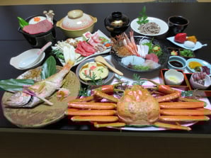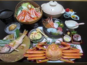 【献立】かにの甲羅の茶碗蒸し/茹でかにの酢の物/近海地魚の刺身/但馬牛のすき鍋/但馬の野菜 鍋用/焼きかに/お吸い物/自家製お漬物/フルーツ
